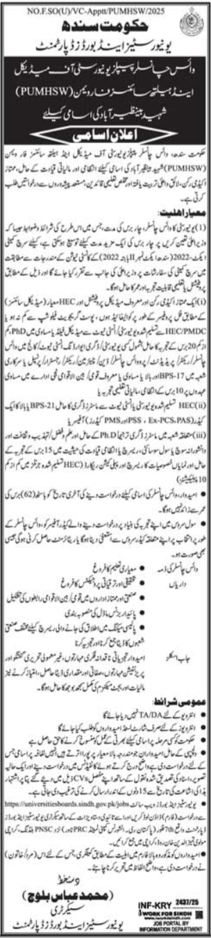 Peoples University of Medical & Health Sciences for Women PUMHSW, Universities & Boards Department jobs advertisement dated about 8 August 2025 in daily Jang Newspaper invites application for the vacant post of vice chancellor in Nawabshah, benazirabad Sindh Pakistan. Educational qualifications required Phd, Master and Others etc.