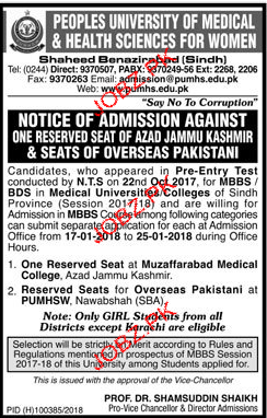 Peoples University of Medical & Health For Women Admission in MBBS / BDS in Shaheed Benazirabad.Admission Open for Both Male / Female Students Morning / Evening Classes. Read newspaper ad for exact details.