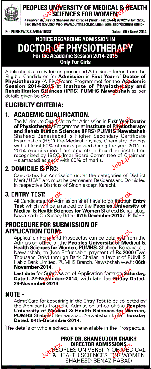 Peoples University of Medical & Health Science For Women Admission in MBBS in Nawab Shah. Read newspaper ad for exact details.