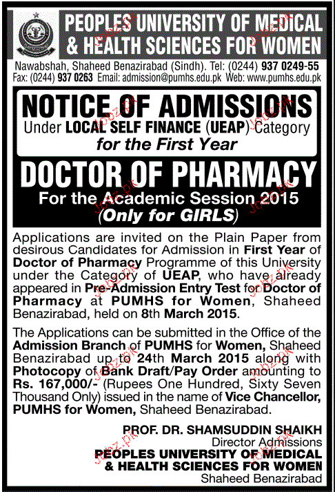 Peoples University of Medical & Health Science For Women admission in D-Pharm in Nawab Shah. Read newspaper ad for exact details.