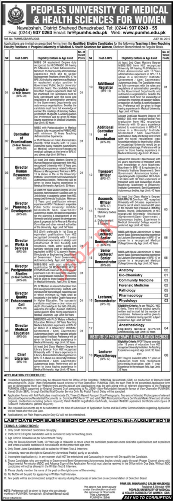 Vacancies in Peoples University of Medical and Health Sciences PUMHS Advertisement July 2019