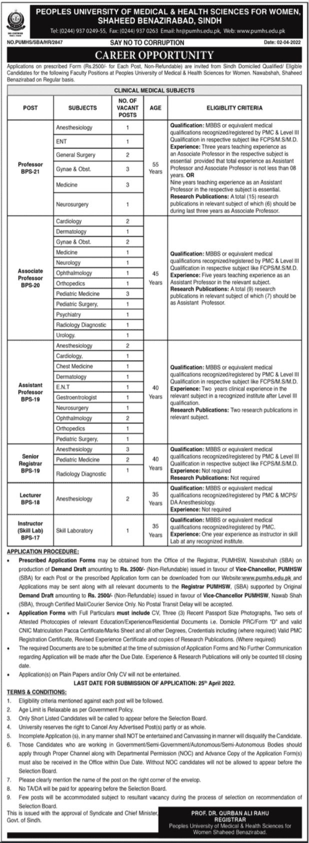 Peoples University of Medical and Health Sciences PUMHS Nawabshah, nawabshah Sindh Pakistan invites applications from eligible candidates for the post of registrar, associate professor, instructor skill lab, professor, lecturer and assistant professor as per advertisement of April 3, 2022 published in daily Jang Newspaper. Educational qualifications required MBBS etc.