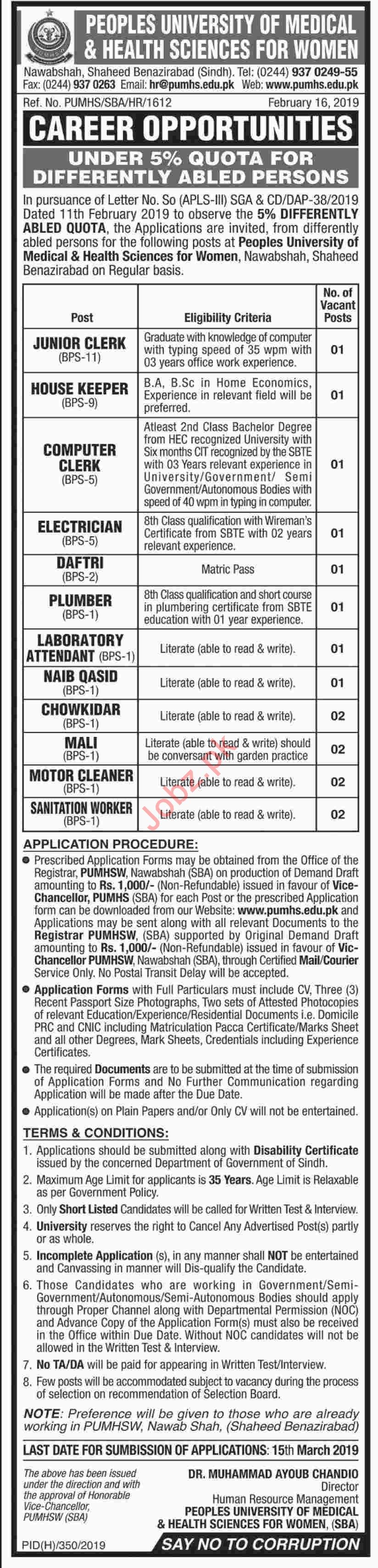 Vacancies in Peoples University of Medical and Health Sciences PUMHS Advertisement February 2019