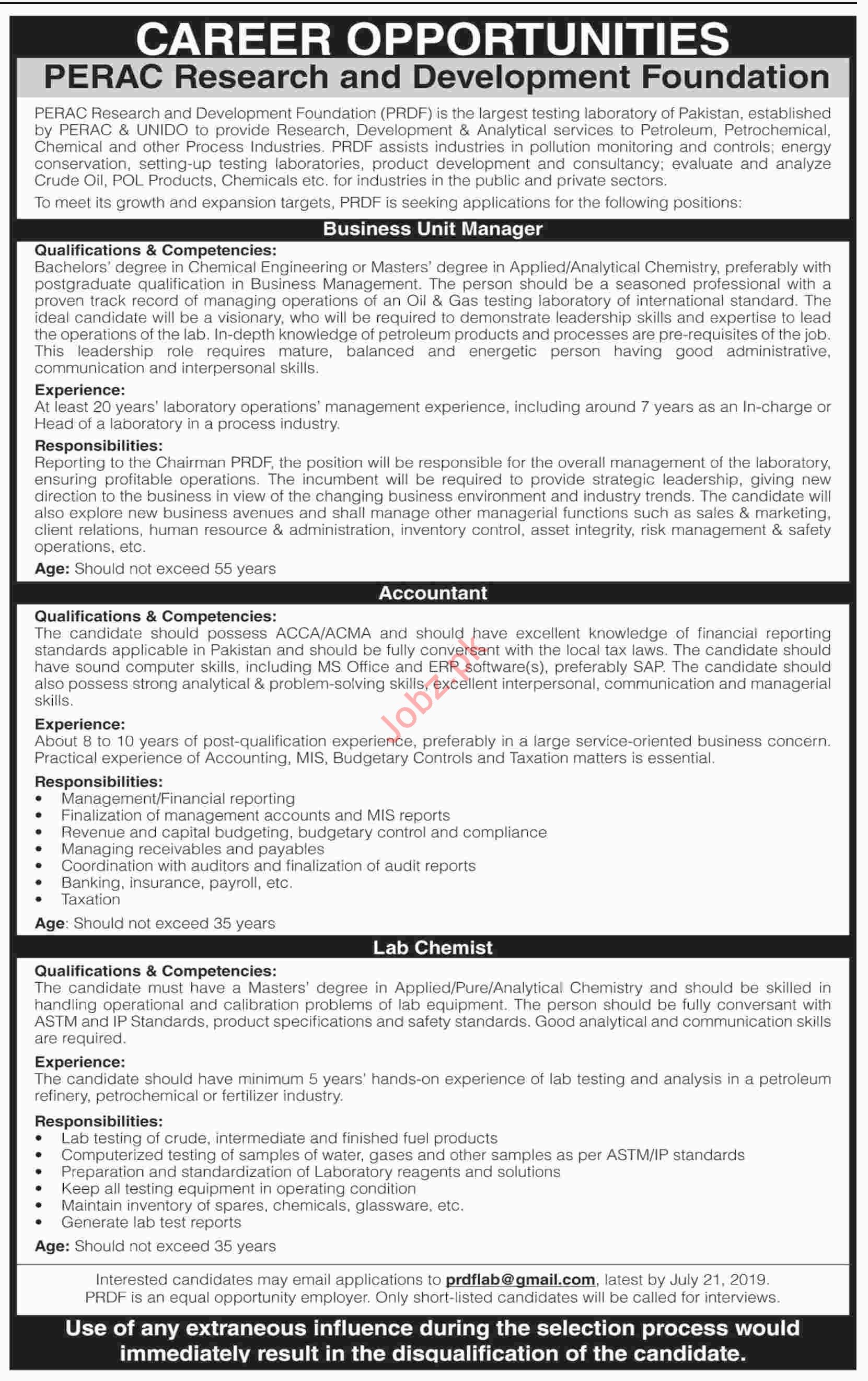 Vacancies in PERAC Research & Development Centre Advertisement July 2019