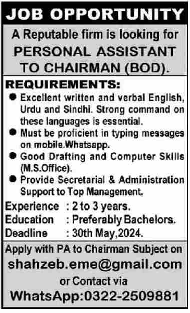 Vacant posts including personal assistant to chairman are announced in Private Firm Karachi, karachi Sindh Pakistan as per 19 May 2024 advertisement in daily Dawn Newspaper. Educational qualifications required Bachelor etc.