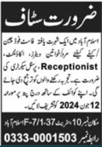 Fast Food Chain jobs advertisement dated about 11 June 2024 in daily Jang Newspaper invites application for the vacant post of accountant, personal secretary, waiter and receptionist in Islamabad, islamabad Islamabad Pakistan. Persons with Middle, Intermediate, Matric, BA and Bachelor etc. education can apply.