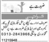 Private Organization invites applications for job positions advertised in daily Express dated 15 April 2022 for following vacancies in Karachi, karachi Sindh Pakistan.