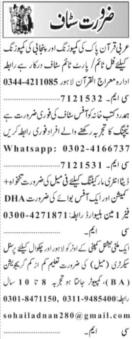 Private Company invites applications for job positions advertised in daily Jang dated 19 August 2022 for following vacancies in Lahore, lahore Punjab Pakistan.