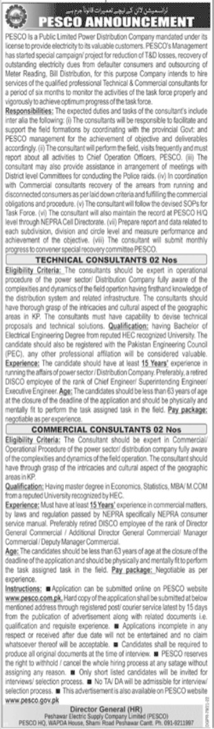 Vacant posts including Technical Consultant and Commercial Consultant are announced in Peshawar Electric Supply Company PESCO Peshawar Khyber Pakhtunkhwa KPK Pakistan as per 16 January 2022 advertisement in daily Jang Newspaper. Candidates with M.com, Bachelor, MBA and B.E etc. educational background will be preferred.