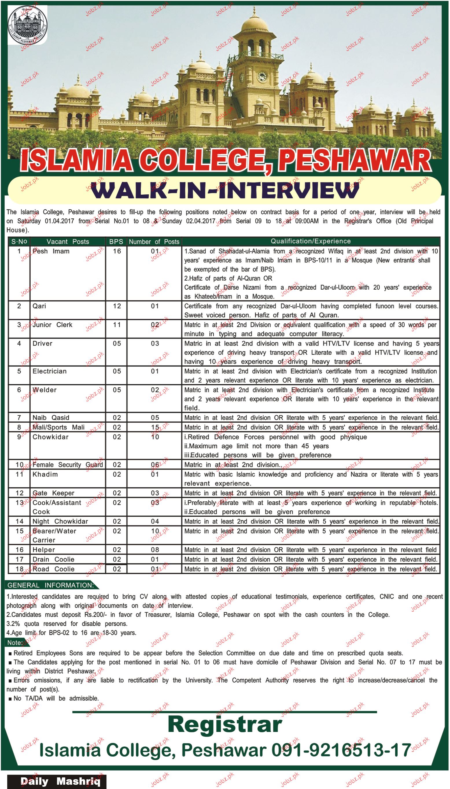 Pesh Immam, Qaris, Junior Clerks, Drivers Job Opportunity