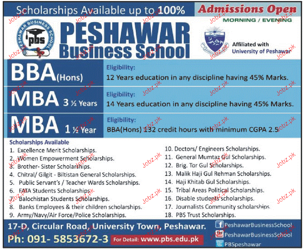 Peshawar Business School Admission in BBA and MBA in Peshawar. Read newspaper ad for exact details.
