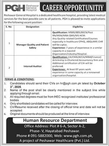 Peshawar General Hospital latest Private Management jobs and others can be applied till 3 October 2025 or as per closing date in newspaper ad. Read complete ad online to know how to apply on latest Peshawar General Hospital job opportunities.