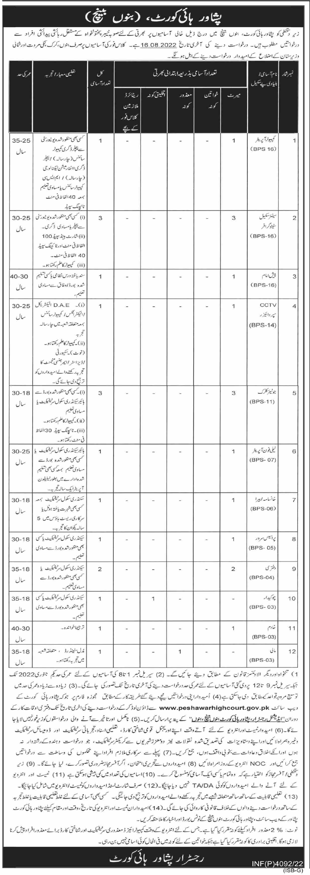 Vacant posts including stenographer, clerk, process server, khadim, cctv supervisor, chef, chowkidar, mali, telephone operator, daftri, computer operator, pesh imam and cook are announced in Peshawar High Court Peshawar, peshawar Khyber Pakhtunkhwa KPK Pakistan as per 8 July 2022 advertisement in daily Dawn Newspaper. Preferred Education is Intermediate, DAE, MS, Matric, Primary, MCS, M.sc, Middle, Others, BA and Bachelor etc.
