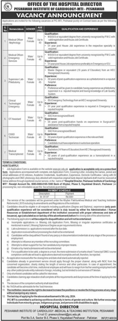 Latest Medical jobs and others Government jobs in Peshawar Institute of Cardiology PIC closing date is around July 5, 2024, see exact from ad. Read complete ad online to know how to apply on latest Peshawar Institute of Cardiology PIC job opportunities.
