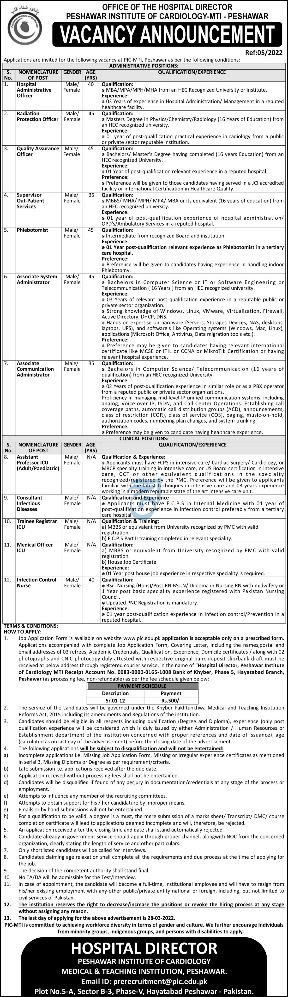 Apply at Peshawar Institute of Cardiology PIC latest Government jobs in Medical and departments before closing date which is around March 28, 2022 or as per closing date in newspaper ad. Read complete ad online to know how to apply on latest Peshawar Institute of Cardiology PIC job opportunities.