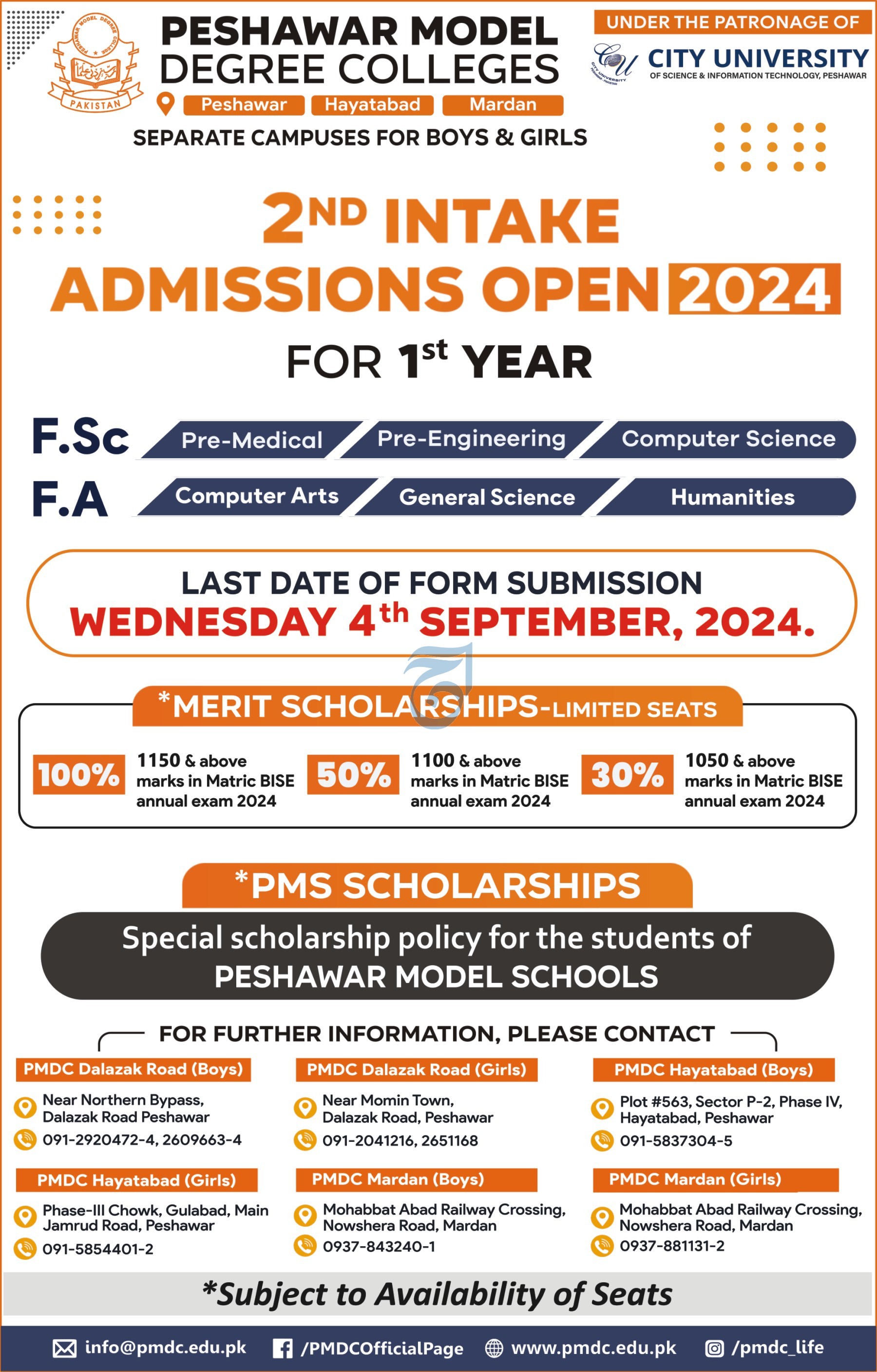 Peshawar Model Degree Colleges admissions 2024 for Pre Medical, Pre Engineering, General Science, Computer Arts, FA, F Sc has been announced. Eligible students who qualify as per admission criteria in Peshawar Model Degree Colleges Peshawar Khyber Pakhtunkhwa KPK Pakistan can apply in Teaching College for academic year 2024. Students who want to enroll for academic session 2024 in Intermediate qualification and admission criteria for Private institute can apply till last date 4 September 2024. Read newspaper ad for exact details.