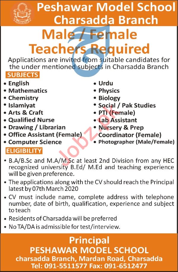 Teacher, English Teacher, Mathematics Teacher, Chemistry Teacher, Islamiyat Teacher, Arts Teacher, Craft Teacher, Urdu Teacher, Physics Teacher, Biology Teacher, Scoal Studies Teacher, Pak Studies Teacher, PTI, Nurse, Lab Assistant, Drawing Teacher, Librarian, Lab Assistant, nursery Coordinator, Prep Coordinator, Office Assistant, Computer Science Teacher, Photographer are required for Peshawar Model School Csharsadda Branch .