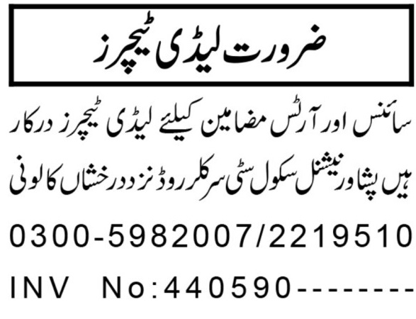 Peshawar National School Circular Road Peshawar, peshawar Khyber Pakhtunkhwa KPK Pakistan invites applications from eligible candidates for the post of science teacher, teacher, lady teacher and arts teacher as per advertisement of April 15, 2025 published in daily Aaj Newspaper. Persons with Bachelor and Master etc. education can apply.