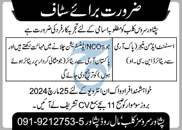 Peshawar Services Club Peshawar, peshawar Khyber Pakhtunkhwa KPK Pakistan invites applications from eligible candidates for the post of assistant admin manager as per advertisement of March 21, 2024 published in daily Aaj Newspaper. Preferred Education is BA and Bachelor etc.