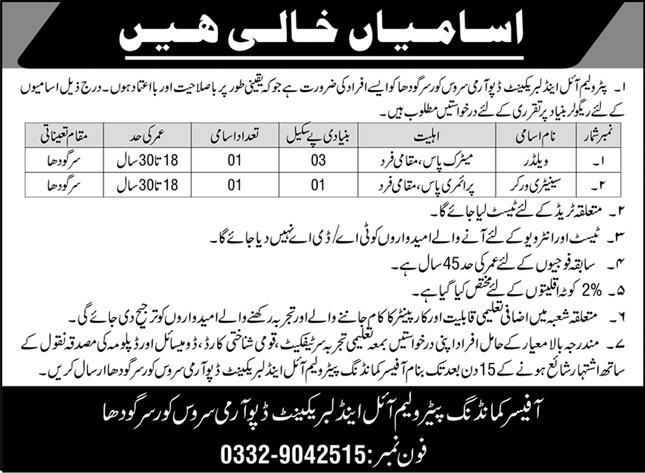 Latest Petroleum Oil & Lubricant Depot Army jobs Posts Sargodha 2025