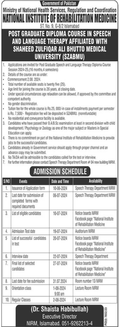 Admissions in National Institute of Rehabilitation Medicine 2024 for Post Graduate Diploma has been announced. Students can enroll for admissions in National Institute of Rehabilitation Medicine Islamabad Islamabad Pakistan for academic year 2024 to continue campus based or online education in Medical University. Students for admissions in P.G Diploma can apply for online or campus classes as per Government institute criteria till admission closing date July 6, 2024. Read newspaper ad for exact details.