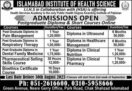 Islamabad Institute of Health Sciences IIHS admissions 2023 for Post Graduate Diploma Programs, Diploma Programs has been announced. Students can enroll for admissions in Islamabad Institute of Health Sciences IIHS Islamabad Islamabad Pakistan for academic year 2023 to continue campus based or online education in Medical College. Eligible candidates for admissions in Diploma and P.G Diploma can apply as per Private institute criteria and before closing date 30 August 2023 after reading advertisement online. Read newspaper ad for exact details.