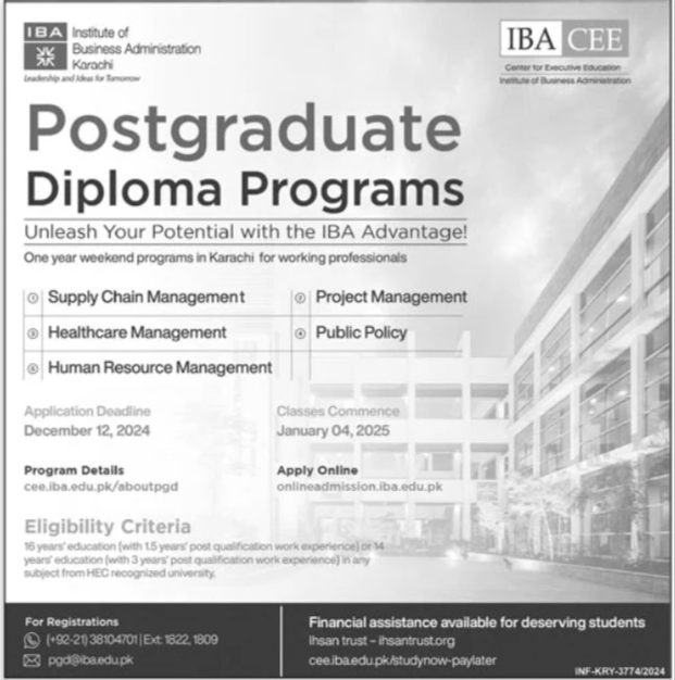 Institute of Business Administration IBA has announced admissions 2024 for Post Graduate Diploma. Institute of Business Administration IBA Karachi Sindh Pakistan welcomes students to apply for admissions in academic year 2024 in Science University. Eligible candidates for admissions in P.G Diploma can apply as per Government institute criteria and before closing date 12 December 2024 after reading advertisement online. Read newspaper ad for exact details.