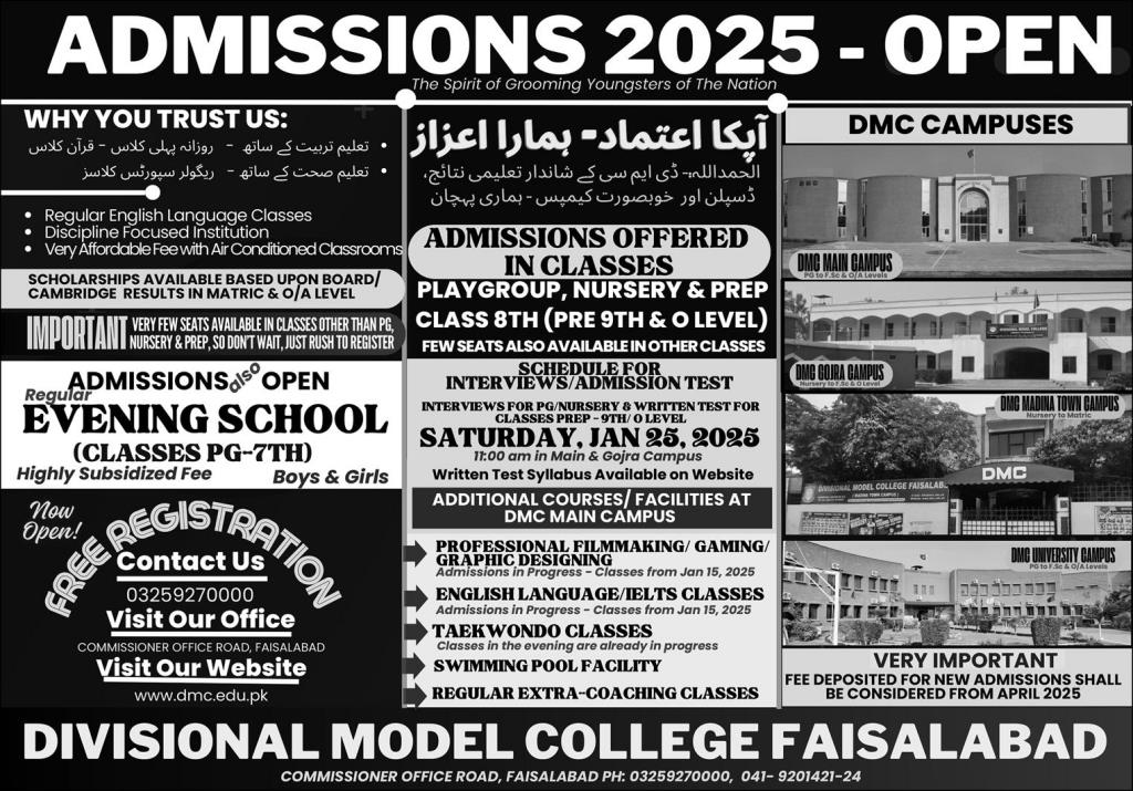 Divisional Model College has announced admissions 2024 for PG to 7th class. Students can enroll for admissions in Divisional Model College Faisalabad Punjab Pakistan for academic year 2024 to continue campus based or online education in Arts School. Students for admissions in Primary and Middle & criteria can apply as per Private institute admission policy 2024 before closing date as per advertisement. Read newspaper ad for exact details.