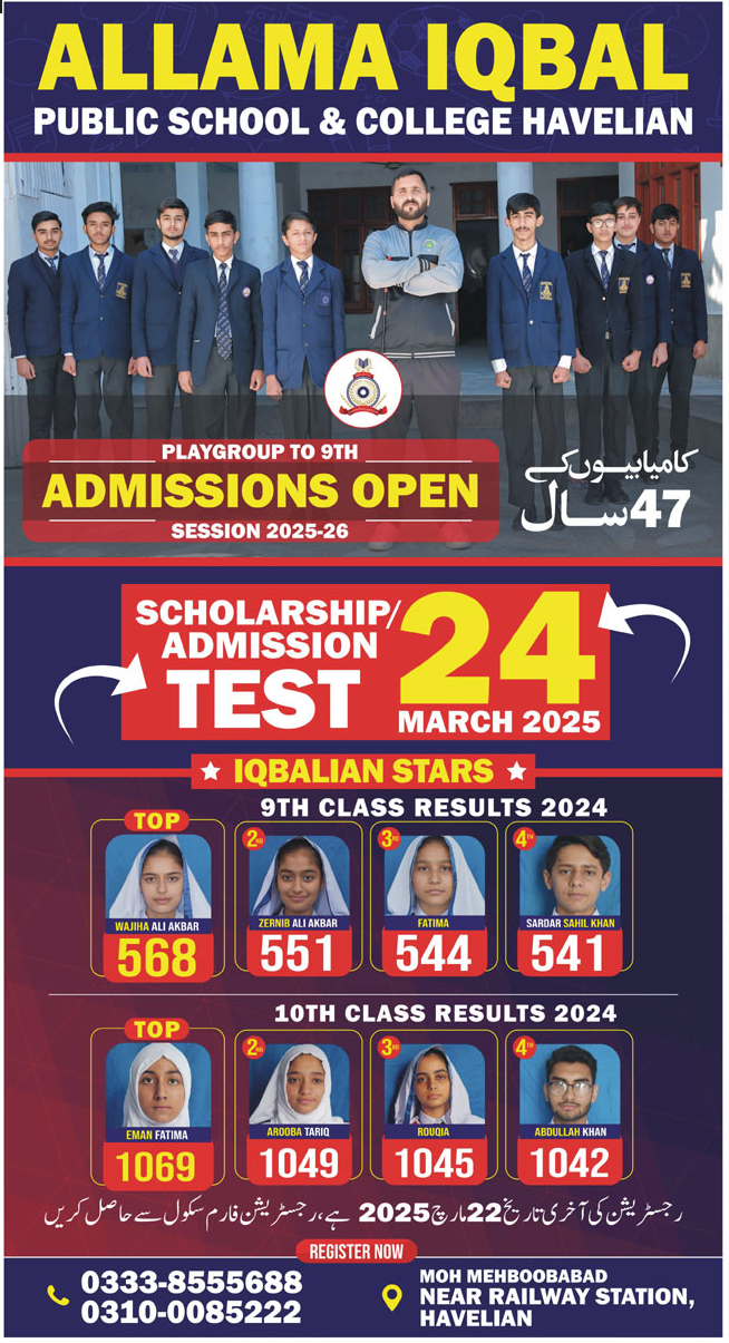Allama Iqbal Public School and College PG To 9th admissions 2025 has been started. Students can enroll for admissions in Allama Iqbal Public School and College Havelian Khyber Pakhtunkhwa KPK Pakistan for academic year 2025 to continue campus based or online education in Science College. Students who want to enroll for academic session 2025 in qualification and admission criteria for Private institute can apply till last date. Read newspaper ad for exact details.