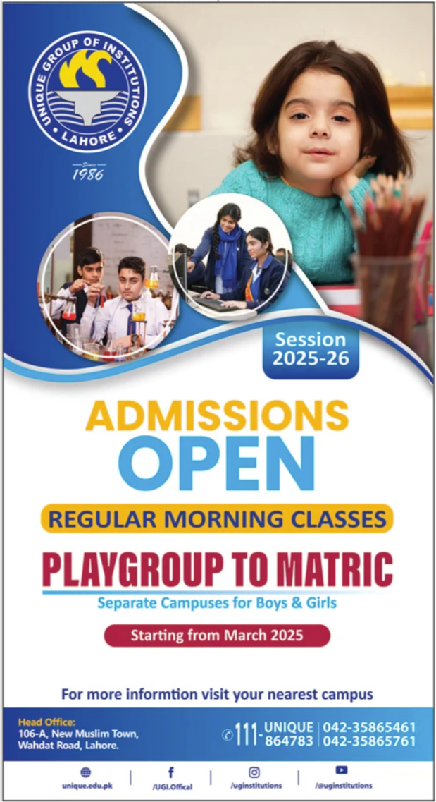 Unique Group of Institutions PG To Matric admissions 2025 has been announced. Eligible students can apply for academic admissions 2025 in Unique Group of Institutions Lahore Punjab Pakistan for Science School. Eligible students for fulfilling criteria for admissions in can enroll as per Private admission policy 2025 till closing date. Read newspaper ad for exact details.