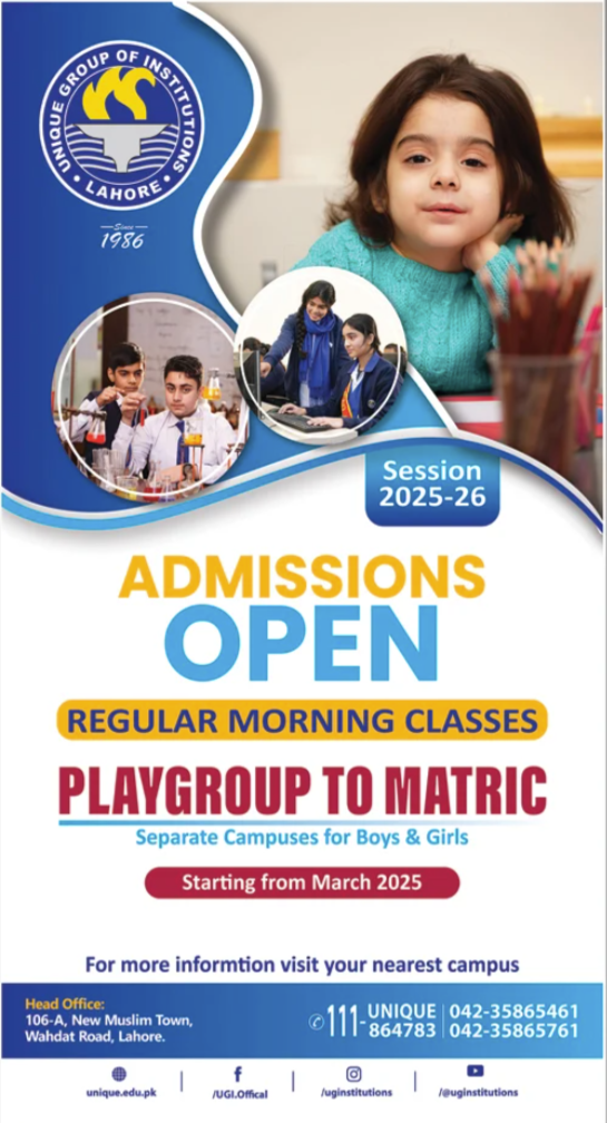 Admissions in Unique Group of Institutions 2025 for PG To Matric has been announced. Unique Group of Institutions Lahore Punjab Pakistan welcomes students to apply for admissions in academic year 2025 in Science School. Eligible candidates for admissions in can apply as per Private institute criteria and before closing date after reading advertisement online. Read newspaper ad for exact details.