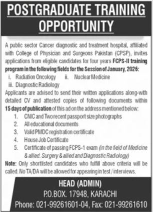 College of Physician and Surgeons Pakistan CPSP Karachi, karachi Sindh Pakistan invites applications from eligible candidates for the post of fcps ii postgraduate training as per advertisement of December 7, 2025 published in daily Jang Newspaper. Others and MBBS etc. educational qualification will be preferred.