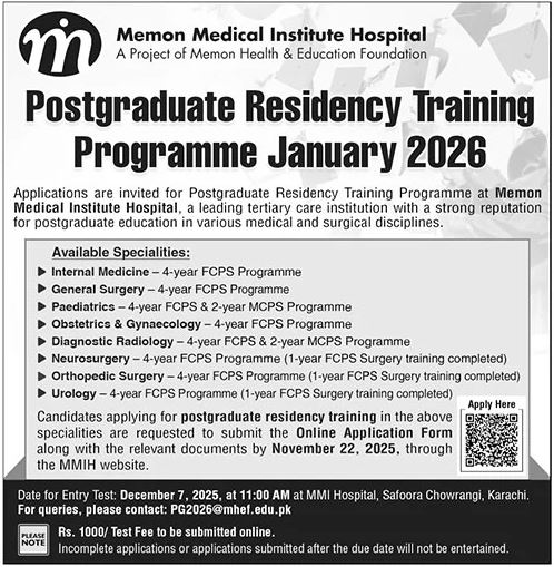 Memon Medical Institute Hospital Safoora Karachi, karachi Sindh Pakistan invites applications from eligible candidates for the post of postgraduate residency training program as per advertisement of November 3, 2025 published in daily The News Newspaper. Educational qualifications required Others and MBBS etc.