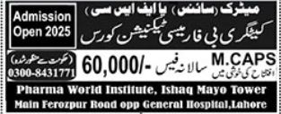Admissions in Pharma World Institute 2025 for Pharm-b has been announced. Students can enroll for admissions in Pharma World Institute Lahore Punjab Pakistan for academic year 2025 to continue campus based or online education in Science College. Students for admissions in can apply for online or campus classes as per Government institute criteria till admission closing date. Read newspaper ad for exact details.