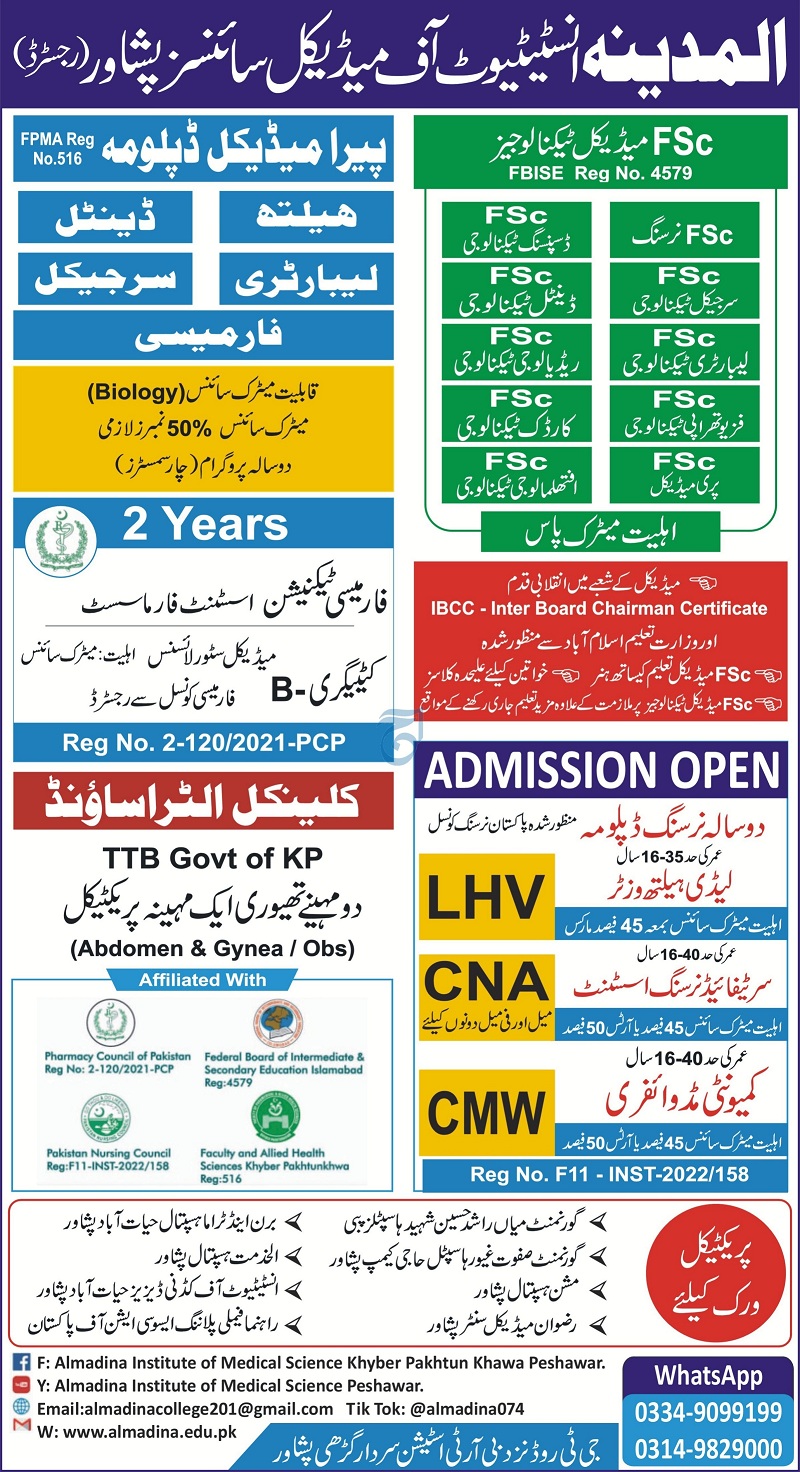 Al Madina Institute of Medical Sciences admissions 2025 for pharm-d has been announced. Al Madina Institute of Medical Sciences Peshawar Khyber Pakhtunkhwa KPK Pakistan welcomes students to apply for admissions in academic year 2025 in Science College. Students for admissions in can apply for online or campus classes as per Government institute criteria till admission closing date. Read newspaper ad for exact details.