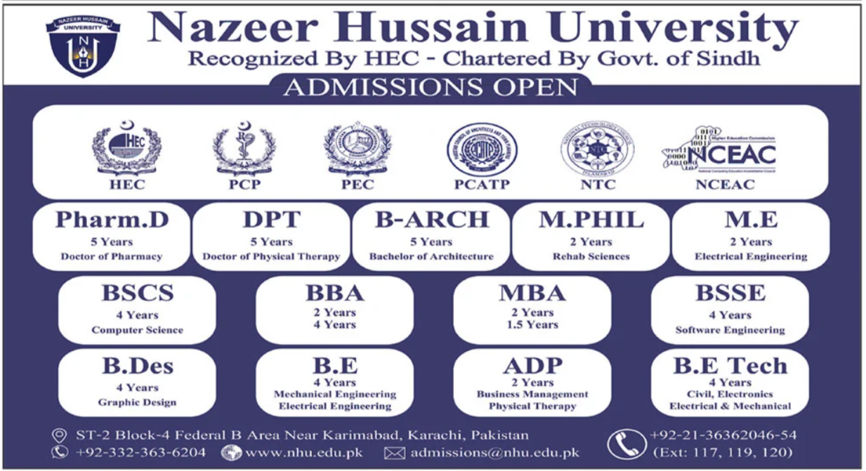 Nazeer Hussain University Pharm-d admissions 2025 has been announced. Eligible students who qualify as per admission criteria in Nazeer Hussain University Karachi Sindh Pakistan can apply in Medical University for academic year 2025. Students for admissions in can apply for online or campus classes as per Government institute criteria till admission closing date. Read newspaper ad for exact details.