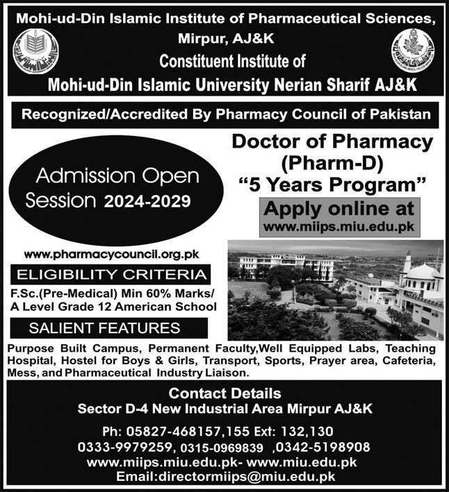 Admissions in Mohi ud Din Islamic Institute of Pharmaceutical Sciences 2024 for Doctor of Pharmacy Pharm D has been announced. Mohi ud Din Islamic Institute of Pharmaceutical Sciences Mirpur AJK Pakistan welcomes students to apply for admissions in academic year 2024 in Medical University. Eligible candidates for admissions in Pharm D can apply as per Government institute criteria and before closing date 15 July 2024 after reading advertisement online. Read newspaper ad for exact details.