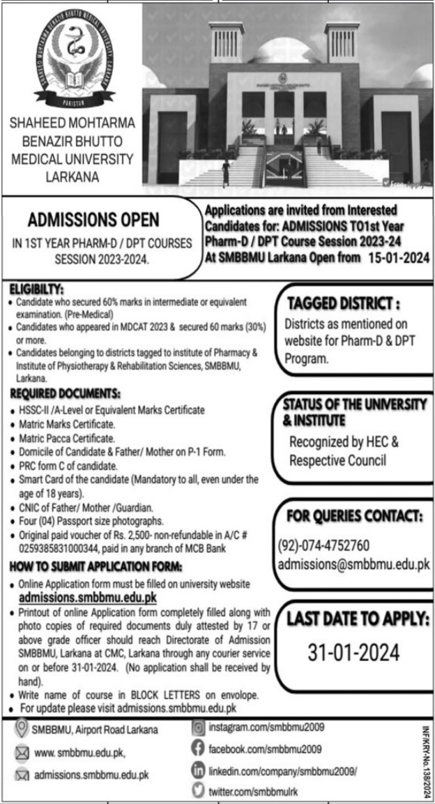 Pharm D and DPT Classes admissions at Benazir Bhutto Medical University Larkana