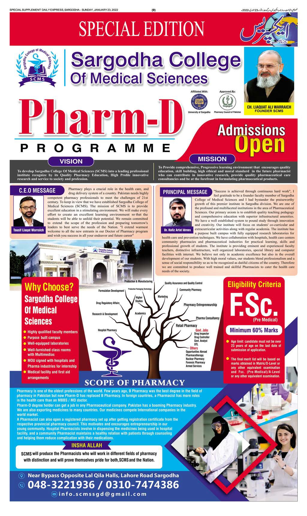 Sargodha College of Medical Sciences Doctor of Pharmacy Pharm-D admissions 2022 has been started. Sargodha College of Medical Sciences Sargodha Punjab Pakistan welcomes students to apply for admissions in academic year 2022 in Medical College. Eligible candidates for admissions in Pharm D can apply as per Private institute criteria and before closing date 22 February 2022 after reading advertisement online. Read newspaper ad for exact details.