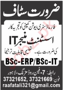 Pharma Distribution Company Lahore, lahore Punjab Pakistan invites applications from eligible candidates for the post of assistant manager it as per advertisement of October 9, 2022 published in daily Jang Newspaper. Candidates with MS, Master and Bachelor etc. educational background will be preferred.