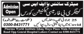 Pharma World Institute is a private sector college has announced online admissions for course in B Pharmacy Technician in Lahore Punjab Pakistan 2021. Read newspaper ad for exact details.