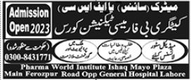 Pharma World Institute B Pharmacy, Pharmacy Technician admissions 2023 has been announced. Eligible students can apply for academic admissions 2023 in Pharma World Institute Lahore Punjab Pakistan for Medical Medical College. Students for admissions in B Pharmacy can apply for online or campus classes as per Private institute criteria till admission closing date January 1, 2024. Read newspaper ad for exact details.