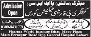 Pharma World Institute Lahore Admissions 2022 for Pharmacy Technician Course