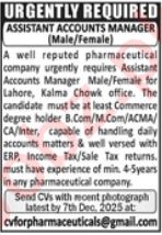 Pharmaceutical Company Lahore, lahore Punjab Pakistan invites applications from eligible candidates for the post of assistant account manager, male staff and female staff as per advertisement of November 30, 2025 published in daily Jang Newspaper. MS, M.com, Master and Bachelor etc. educational qualification will be preferred.