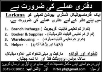 Pharmaceutical Distribution Company jobs advertisement dated about 4 April 2022 in daily Kawish Newspaper invites application for the vacant post of branch incharge, warehousing, helper, supplier and booker in Larkana, larkana Sindh Pakistan. Candidates with Middle, Bachelor, Matric and Intermediate etc. educational background will be preferred.