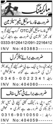 Marketing Company jobs advertisement dated about 1 February 2022 in daily Aaj Newspaper invites application for the vacant post of executive sales, sales executive, salesman, Pharmaceutical Manager, manager and salesgirl in Peshawar Khyber Pakhtunkhwa KPK Pakistan. Persons with Matric, Intermediate, Middle and Bachelor etc. education can apply.