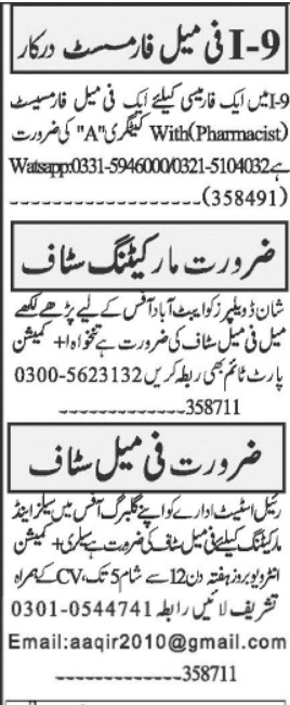 Pharmacist & Marketing Staff Jobs 2022 in Islamabad
