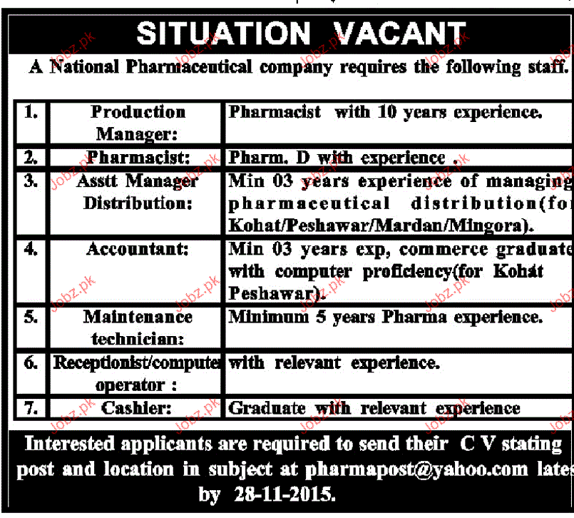 Pharmacists, Accountant, Production Manager Job Opportunity
