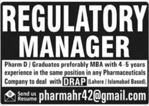 Pharma Company jobs advertisement dated about 3 April 2022 in daily Jang Newspaper invites application for the vacant post of regulatory manager in Lahore, lahore Punjab Pakistan. Persons with Bachelor etc. education can apply.