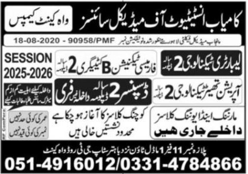 Kamyab Institute of Medical Sceinces in Ralwapingi Islamabad Pharmacy Technician admissions 2025 has been announced. Eligible students who qualify as per admission criteria in Kamyab Institute of Medical Sceinces in Ralwapingi Islamabad Rawalpindi Punjab Pakistan can apply in Science Course for academic year 2025. Students for admissions in can apply for online or campus classes as per Private institute criteria till admission closing date. Read newspaper ad for exact details.